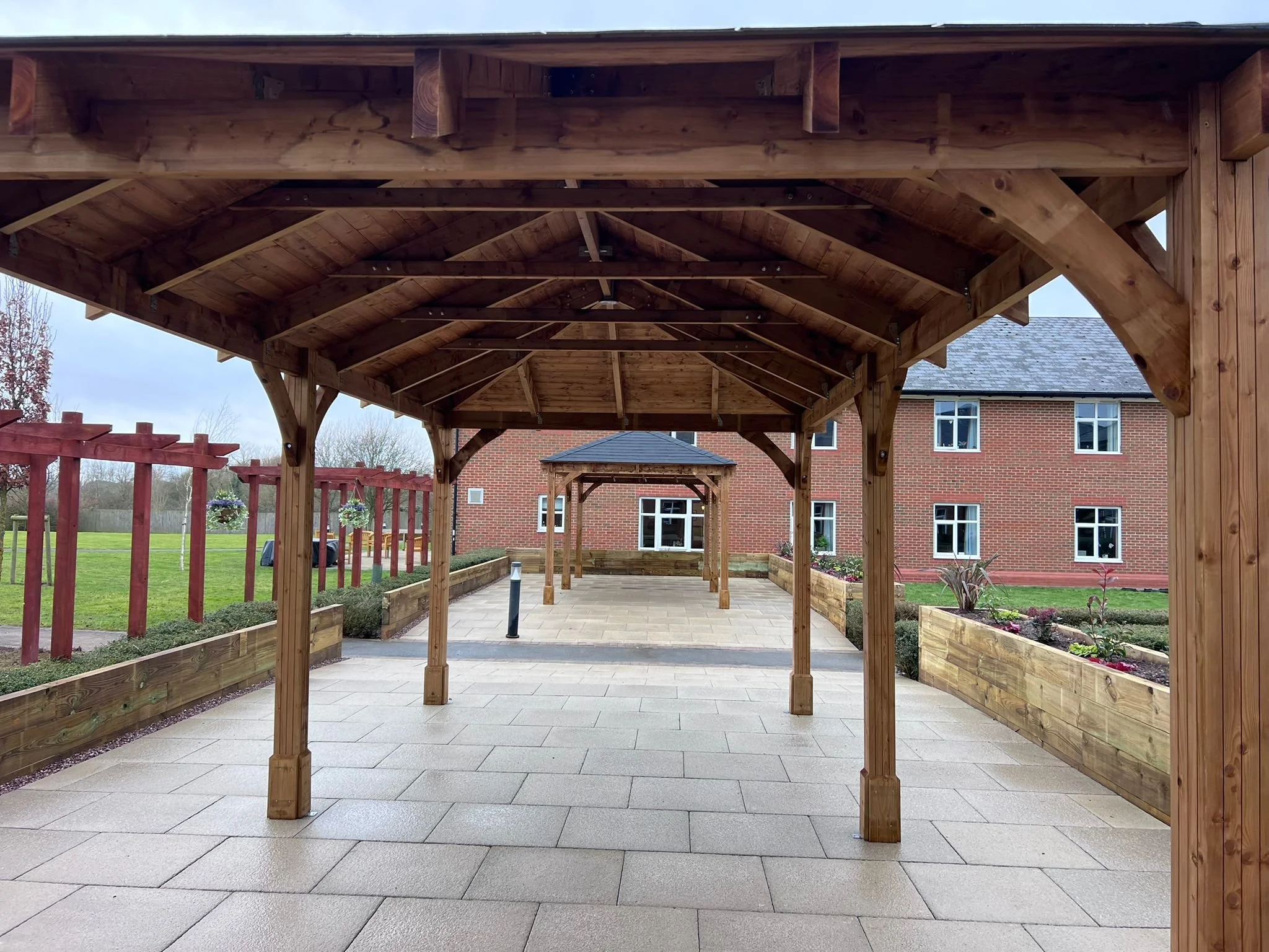 The soft planting provides colour and texture, while the pergola adds shade and structure, creating a tranquil retreat that encourages time spent outdoors and enhances the overall care home environment.